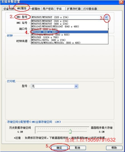 3、選擇“HMI 屬性”項,在 HMI 型號中,點下拉箭頭選擇 MT8104X 相對應(yīng)的選項。